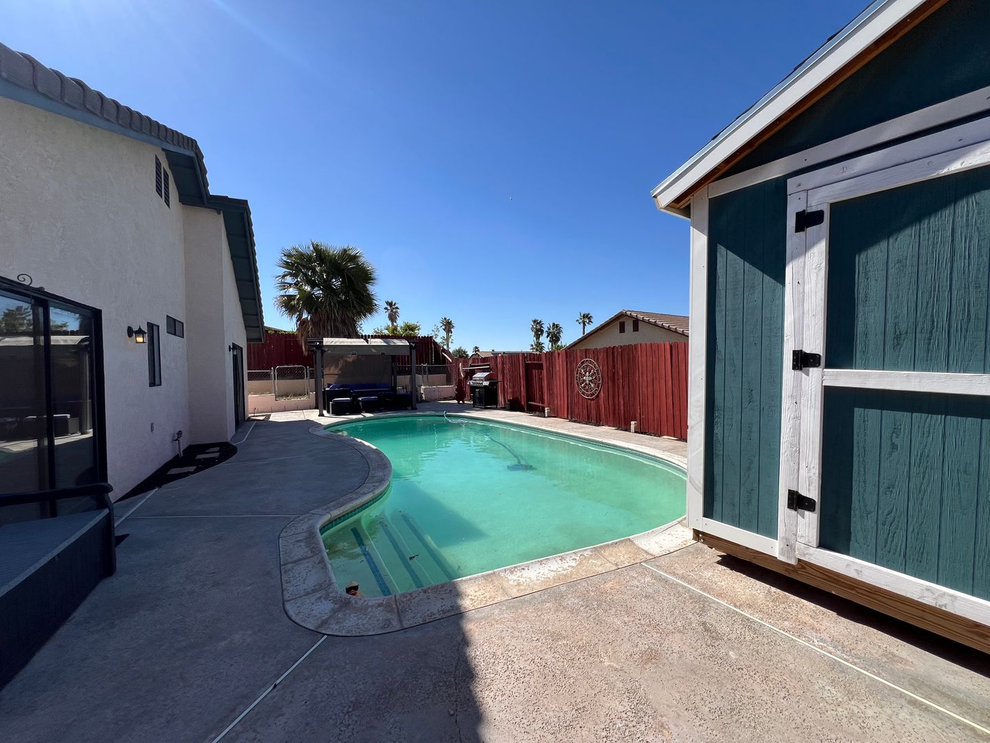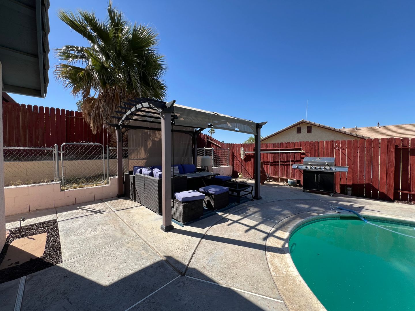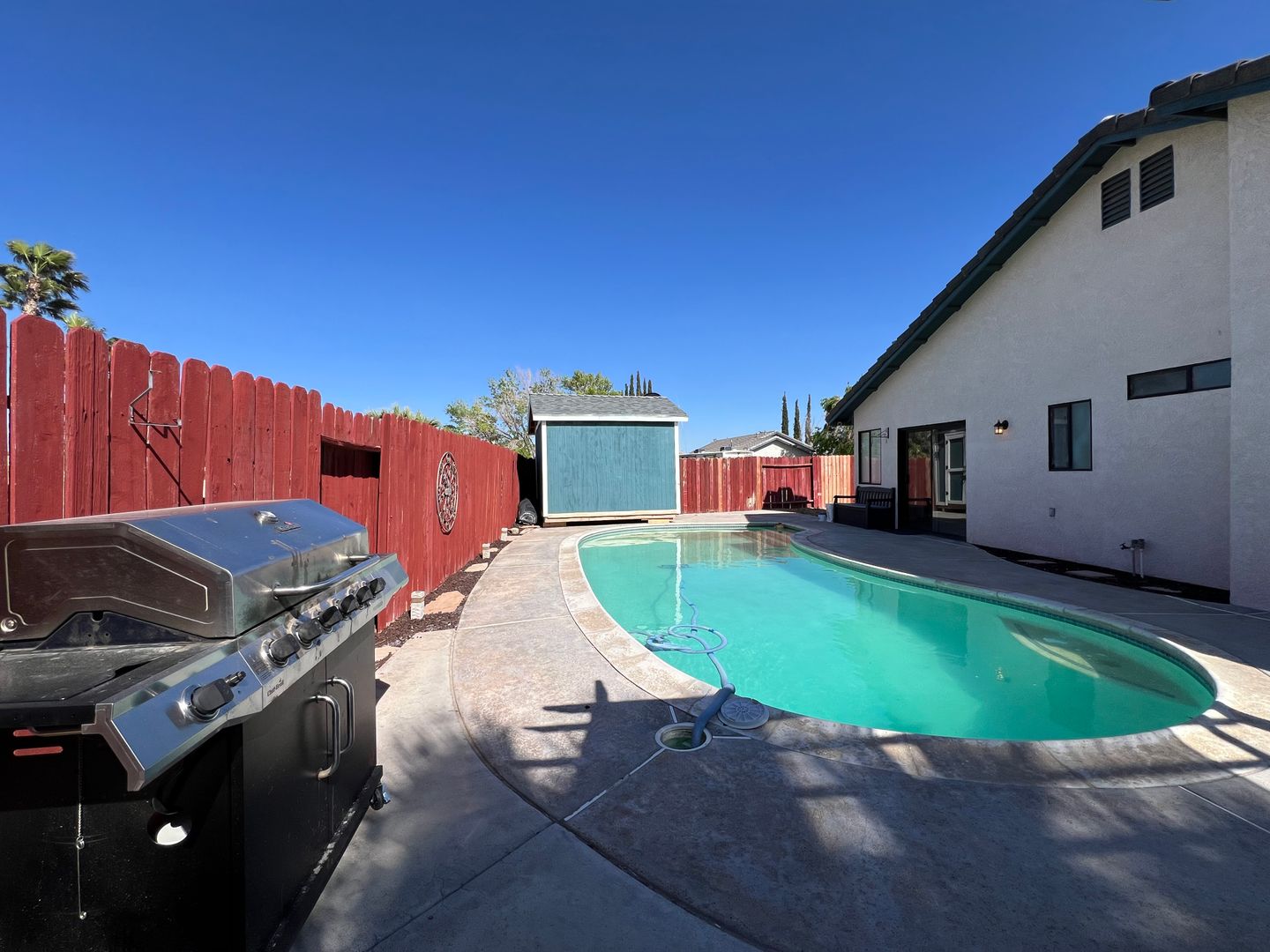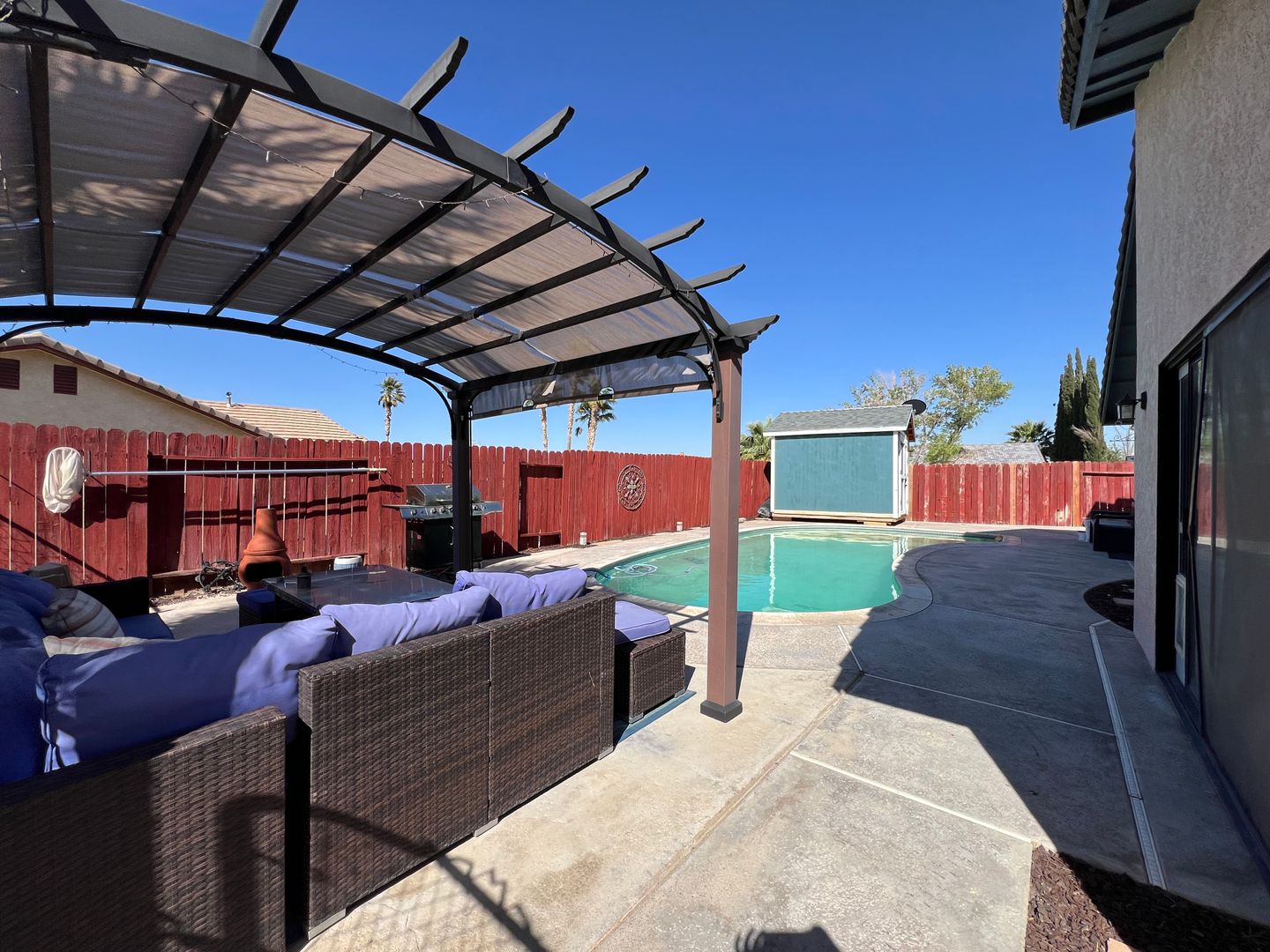 Welcome to your new home in Barstow, CA! This 3 bedroom, 2 bathroom house comes with a sparkling swimming pool, so you can relax and enjoy the California sunshine. The 2 car garage includes an electric car charger for your convenience, and the solar panels help keep your energy costs low. With central heat and air, you'll stay comfortable year-round. The backyard features a storage shed, patio furniture under a pergola, and a BBQ grill for outdoor entertaining. Pets are allowed with a deposit, and the fenced backyard provides a safe space for them to play. Inside, you'll find a stove, refrigerator, and a laundry room with washer/dryer hookups. Cozy up by the fireplace in the living room with high ceilings, or enjoy a meal in the breakfast nook. The master bathroom boasts dual sinks, and the master bedroom includes a walk-in closet for all your storage needs. Located in College Heights, this house is the perfect place to call home.