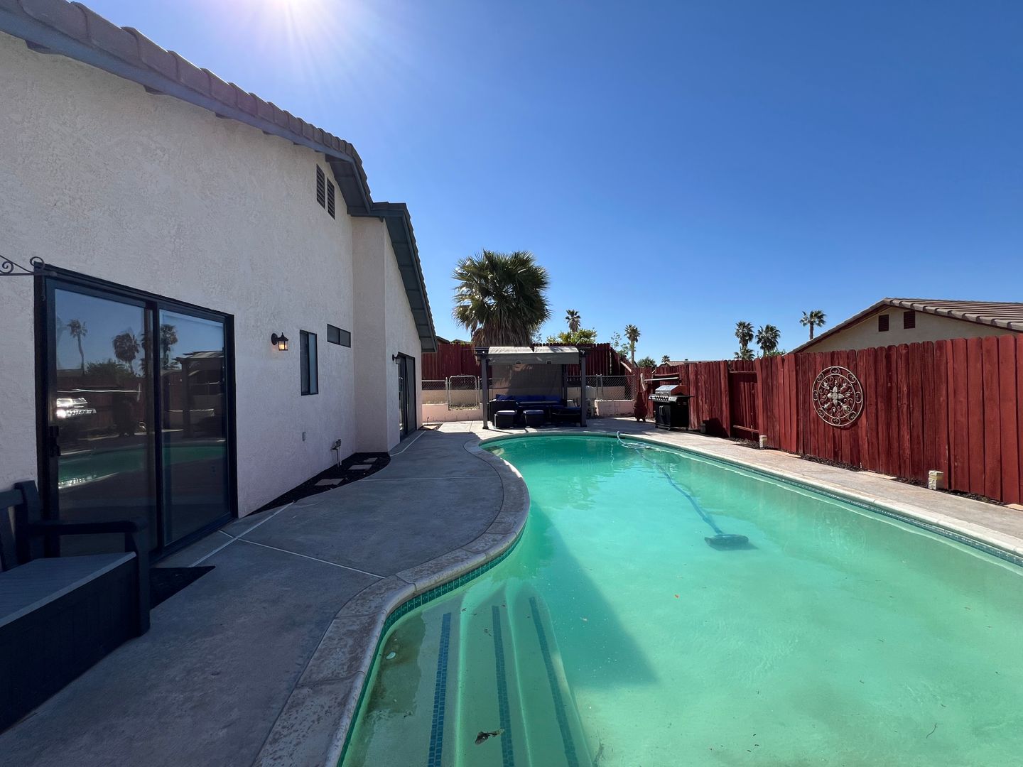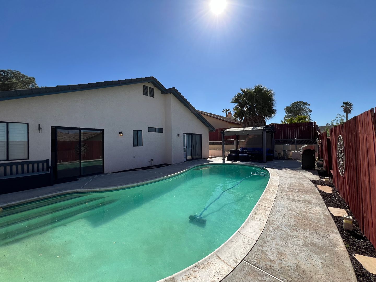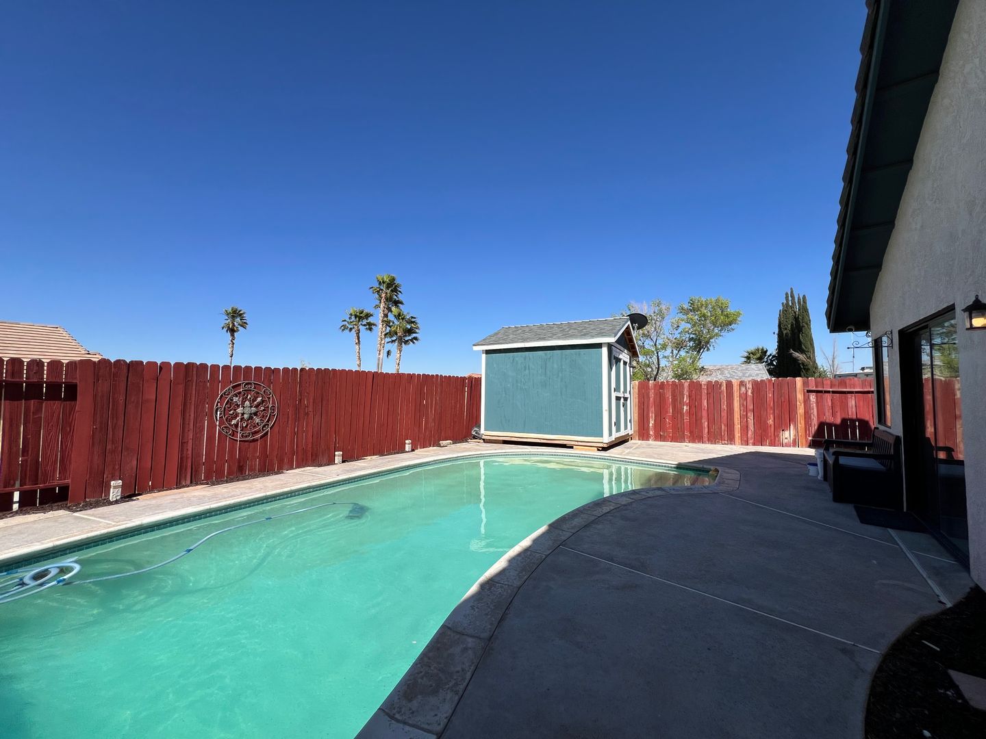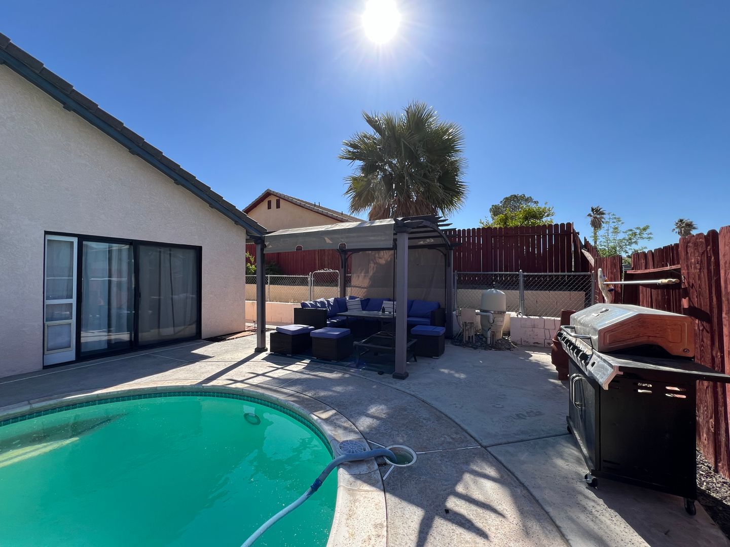 Welcome to your new home in Barstow, CA! This 3 bedroom, 2 bathroom house comes with a sparkling swimming pool, so you can relax and enjoy the California sunshine. The 2 car garage includes an electric car charger for your convenience, and the solar panels help keep your energy costs low. With central heat and air, you'll stay comfortable year-round. The backyard features a storage shed, patio furniture under a pergola, and a BBQ grill for outdoor entertaining. Pets are allowed with a deposit, and the fenced backyard provides a safe space for them to play. Inside, you'll find a stove, refrigerator, and a laundry room with washer/dryer hookups. Cozy up by the fireplace in the living room with high ceilings, or enjoy a meal in the breakfast nook. The master bathroom boasts dual sinks, and the master bedroom includes a walk-in closet for all your storage needs. Located in College Heights, this house is the perfect place to call home.