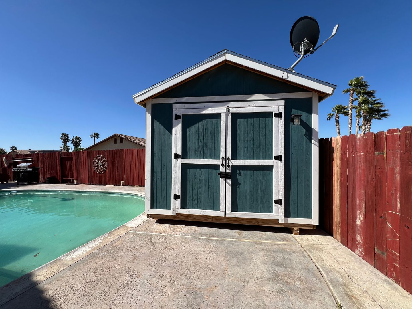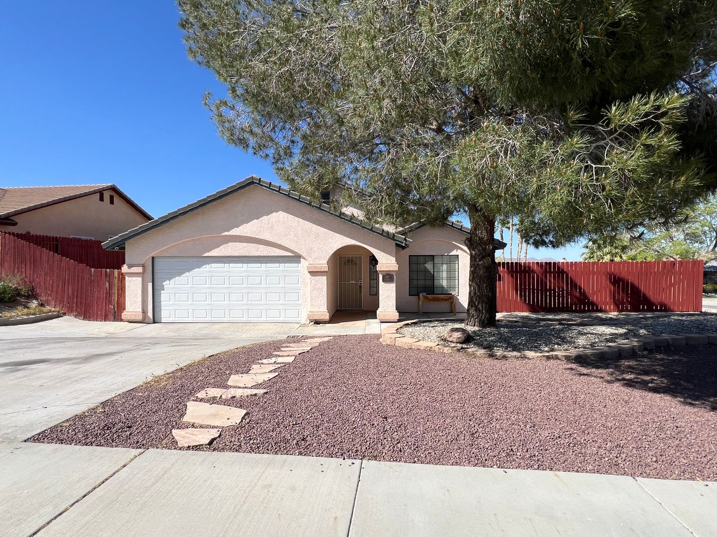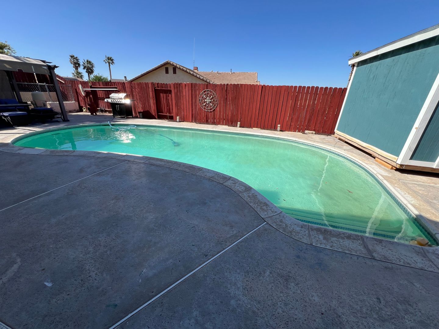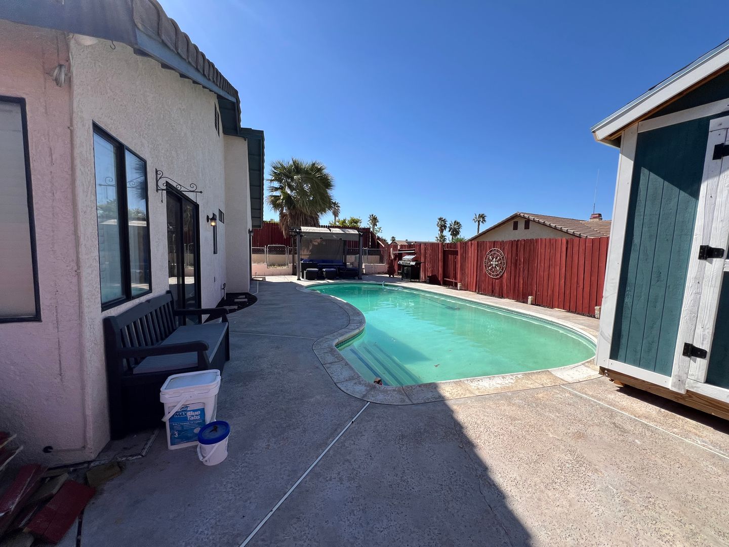 Welcome to your new home in Barstow, CA! This 3 bedroom, 2 bathroom house comes with a sparkling swimming pool, so you can relax and enjoy the California sunshine. The 2 car garage includes an electric car charger for your convenience, and the solar panels help keep your energy costs low. With central heat and air, you'll stay comfortable year-round. The backyard features a storage shed, patio furniture under a pergola, and a BBQ grill for outdoor entertaining. Pets are allowed with a deposit, and the fenced backyard provides a safe space for them to play. Inside, you'll find a stove, refrigerator, and a laundry room with washer/dryer hookups. Cozy up by the fireplace in the living room with high ceilings, or enjoy a meal in the breakfast nook. The master bathroom boasts dual sinks, and the master bedroom includes a walk-in closet for all your storage needs. Located in College Heights, this house is the perfect place to call home.