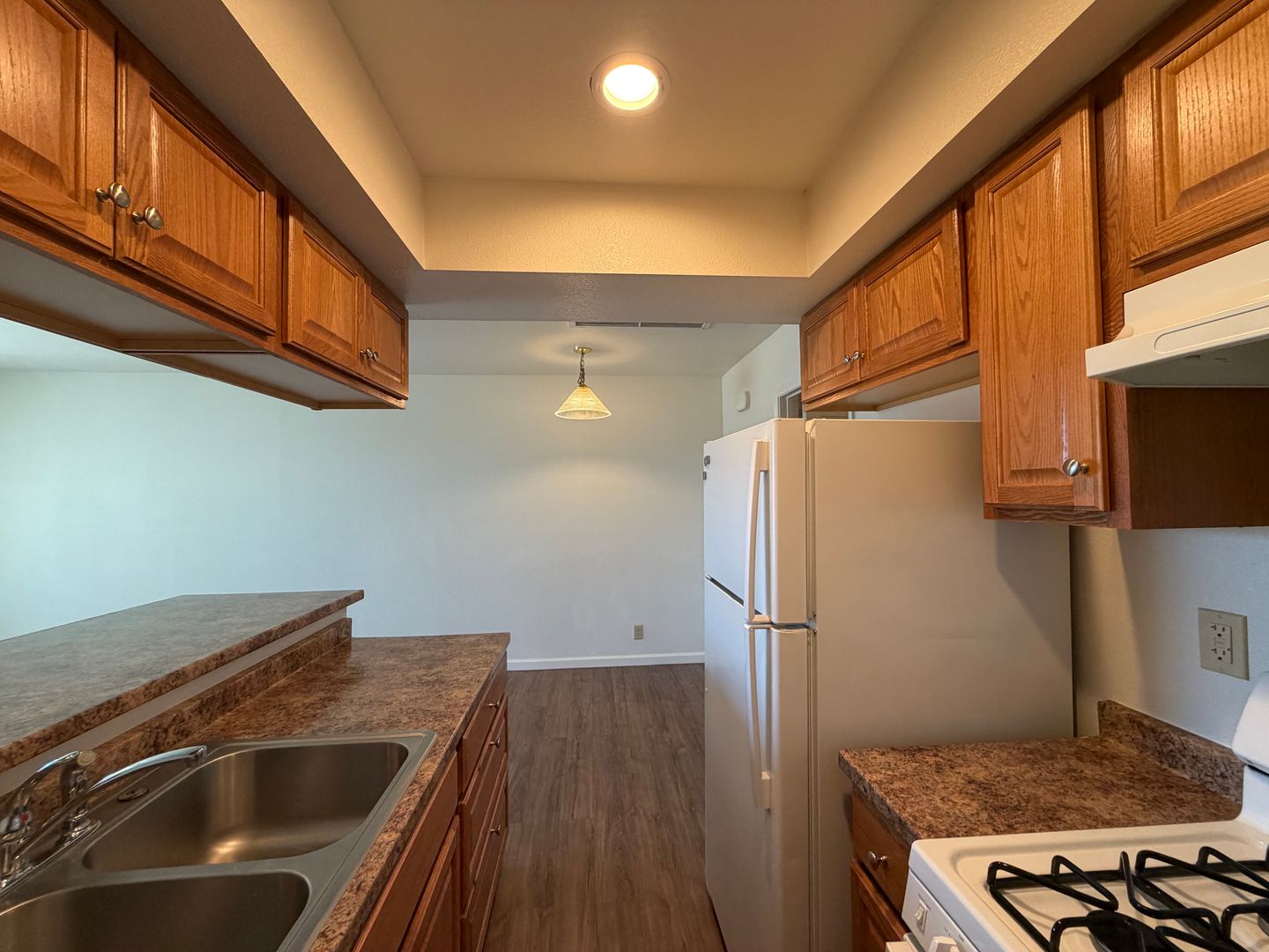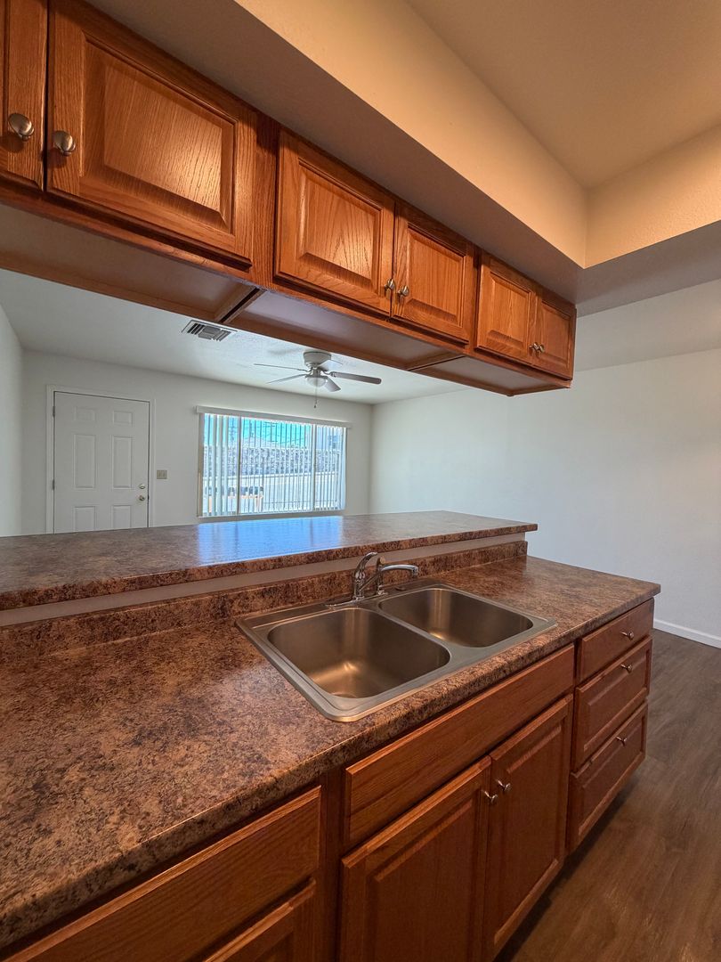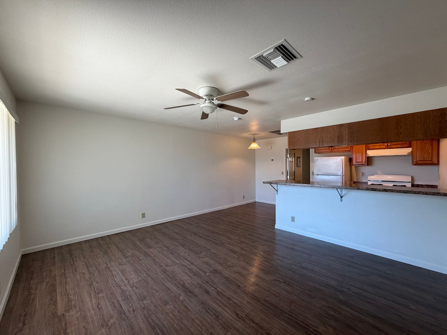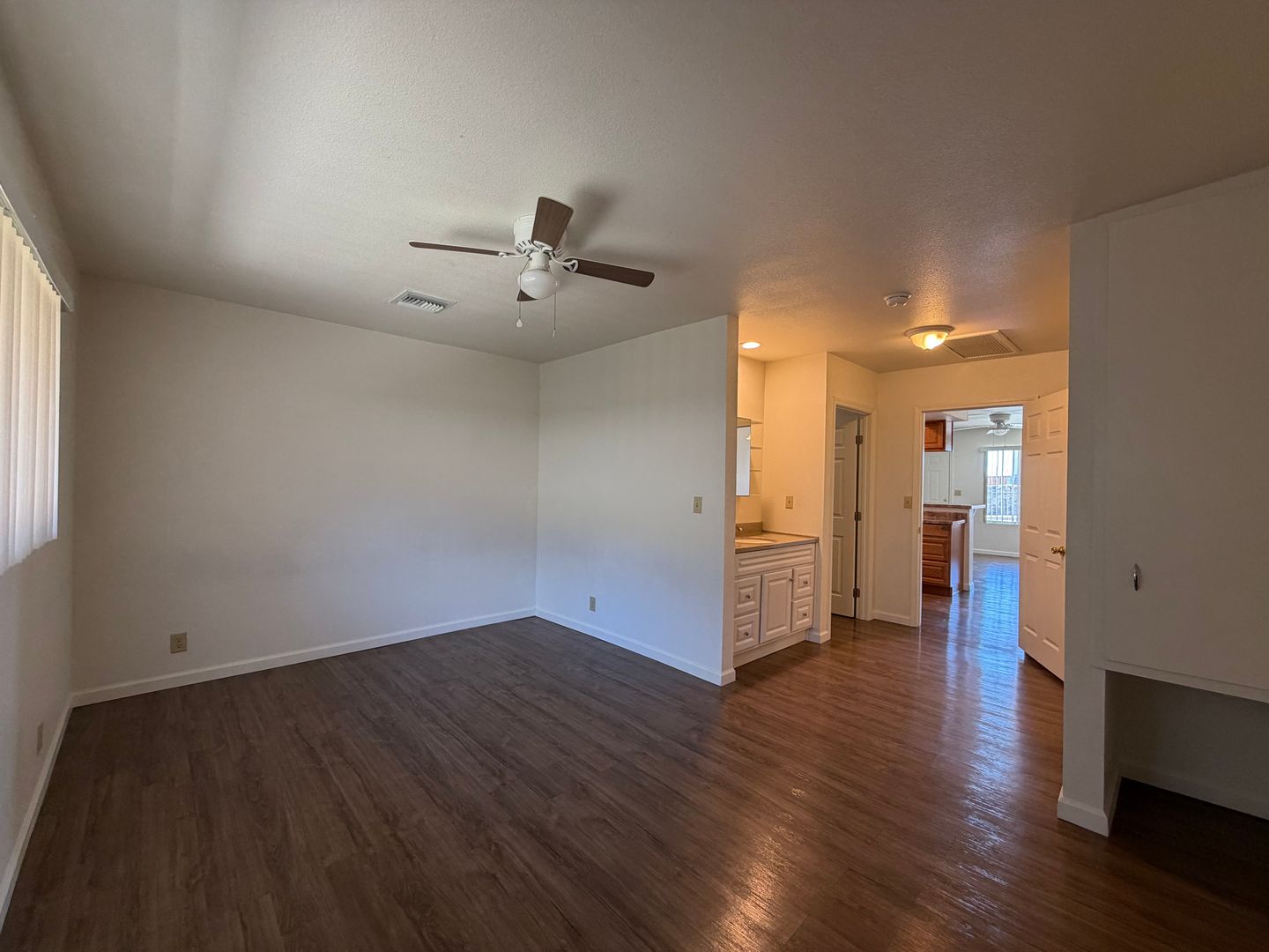 Discover this newly remodeled, spacious 1-bedroom, 1-bath apartment in a gated complex in Barstow, CA. The unit features wood flooring throughout, a large bedroom with mirrored closet doors, ceiling fans in the dining room and bedroom, and an HVAC unit providing both air conditioning and heating. The kitchen includes a stove, refrigerator, and new cabinets and countertops, while the bathroom offers a new vanity. Blinds are installed throughout, and water, sewer, and trash are included. On-site laundry is available. Pets are not allowed.